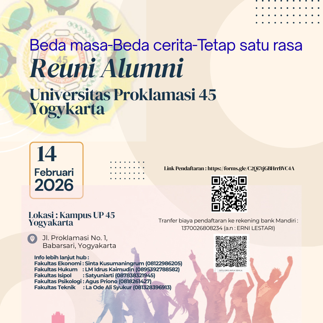 Universitas Proklamasi 45 Yogyakarta akan menggelar Reuni Alumni pada 14 Februari 2026 di Kampus UP 45, Jl. Proklamasi No. 1, Babarsari, Yogyakarta. Mengusung tema “Beda Masa-Beda Cerita-Tetap Satu Rasa”, acara ini bertujuan menyatukan kembali alumni dari berbagai angkatan untuk saling berbagi cerita dan mempererat tali silaturahmi.
