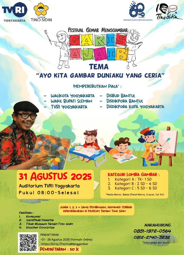 TVRI Yogyakarta mengundang seluruh anak-anak untuk mengekspresikan kreativitas dan keceriaan mereka dalam lomba menggambar bertajuk “Duniaku yang Ceria” yang akan berlangsung di Auditorium TVRI Yogyakarta mulai pukul 08.00 WIB hingga selesai. Lomba ini menghadirkan panggung seni untuk anak-anak usia TK hingga kelas 6 SD dengan tiga kategori usia yang menarik.